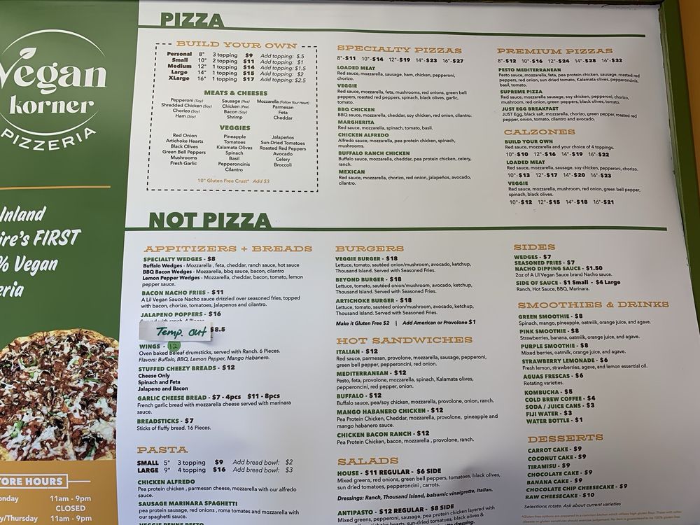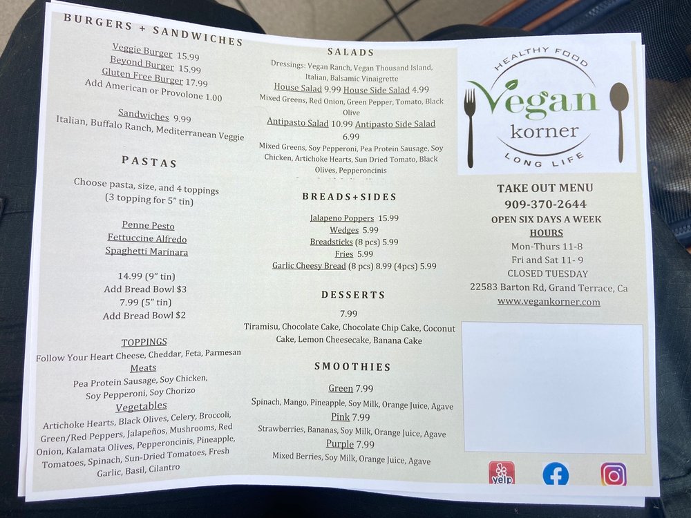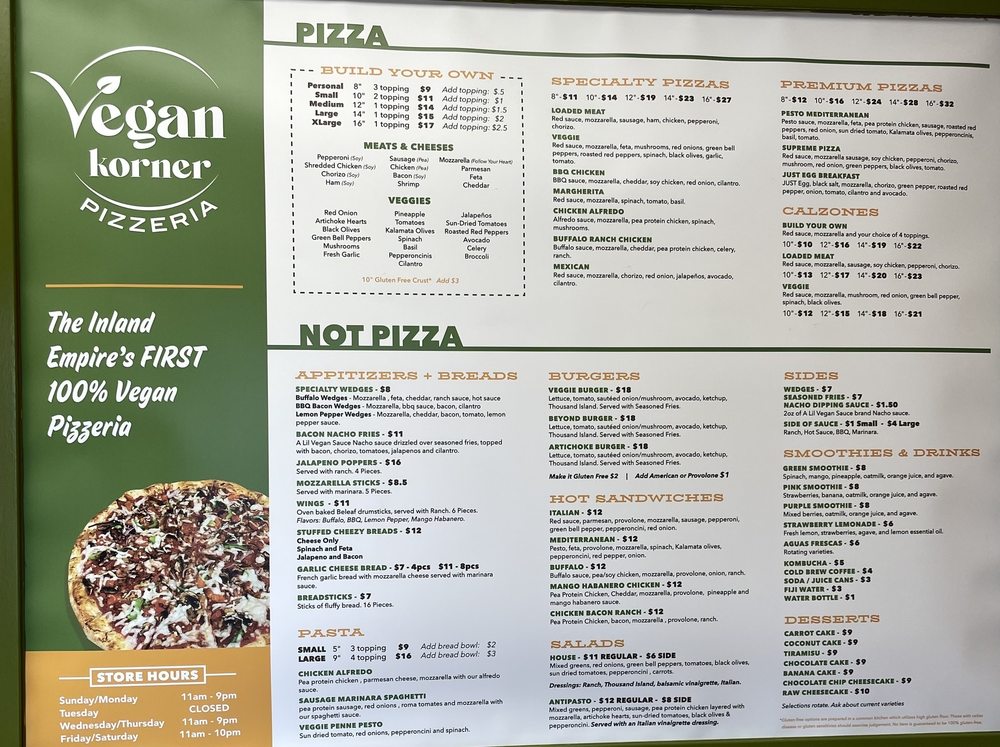 Welcome to Vegan Korner, a cozy gem located at 22583 Barton Rd, Grand Terrace. This vegan haven specializes in Italian delights such as pizzas and sandwiches, making it a perfect stop for both lunch and dinner. The menu presents a rich variety, from the indulgent Bacon Nacho Fries to the unique Just Egg Breakfast Pizza, tantalizing your taste buds with bold flavors and fresh ingredients.